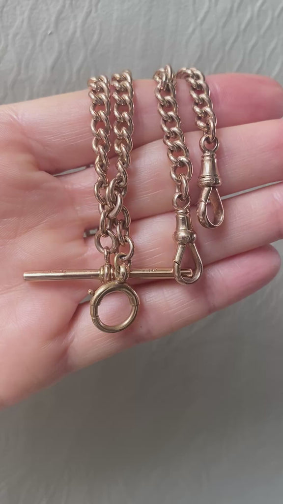 This slightly rosy gold antique English Edwardian Albert chain is hallmarked for Birmingham, 1901. It measures 17" long, weighs 40g and is marked on each link and dog clip for 9k gold. The spring ring is an addition (likely replacing a fob). Both dog clips and bolt ring have working springs and close securely.