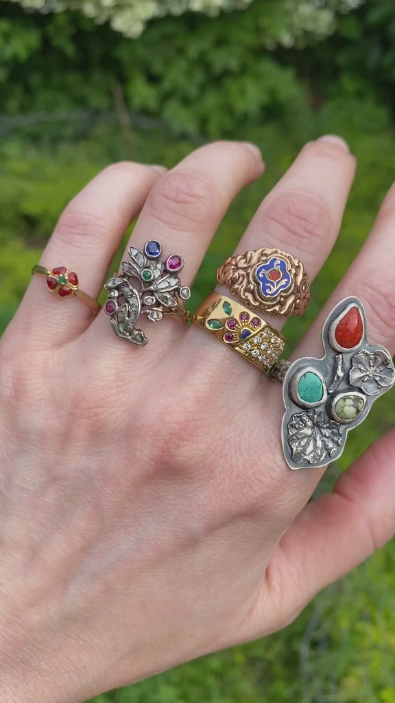 An incredibly rare southern Italian Bourbon-era fede ring circa 1830, from what was formerly known as The Kingdom of the Two Sicilies (which later became Italy). Jewels from this region and period are quite scarce. This ring is crafted in 9k gold and features an enamelled forget-me-not flower on the central plate, which symbolizes "Remembrance".