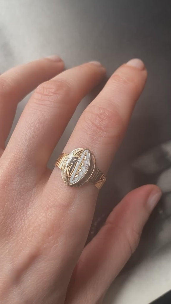 An incredibly rare southern Italian Bourbon-era fede ring circa 1850s, from what was formerly known as The Kingdom of the Two Sicilies. Jewels from this region and period are quite scarce. This ring is crafted in 9k rosy gold and features white and black enamel and beautiful engraving on the shoulders and ring face. The "R" is for "Ricordo", which translates to "Remembrance".