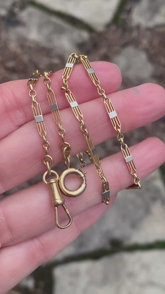 This beautiful two-tone gold French antique watch chain measures about 14.5" long, weighs 9.6g and was crafted in 18k gold. Hallmarked on the chain, spring ring and dog clip.  You will receive the pictured chain.