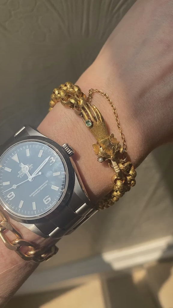 This fine example of a Georgian c. 1820 bracelet features a double strand of coveted star-decorated links and a striking clasp/closure - a hand with intricate three-dimensional foliate details on the cuff and fingernails that wears an emerald ring and pearls in its cuff. So rare to find intact as many were melted down, the hand clasp converted to pendant.