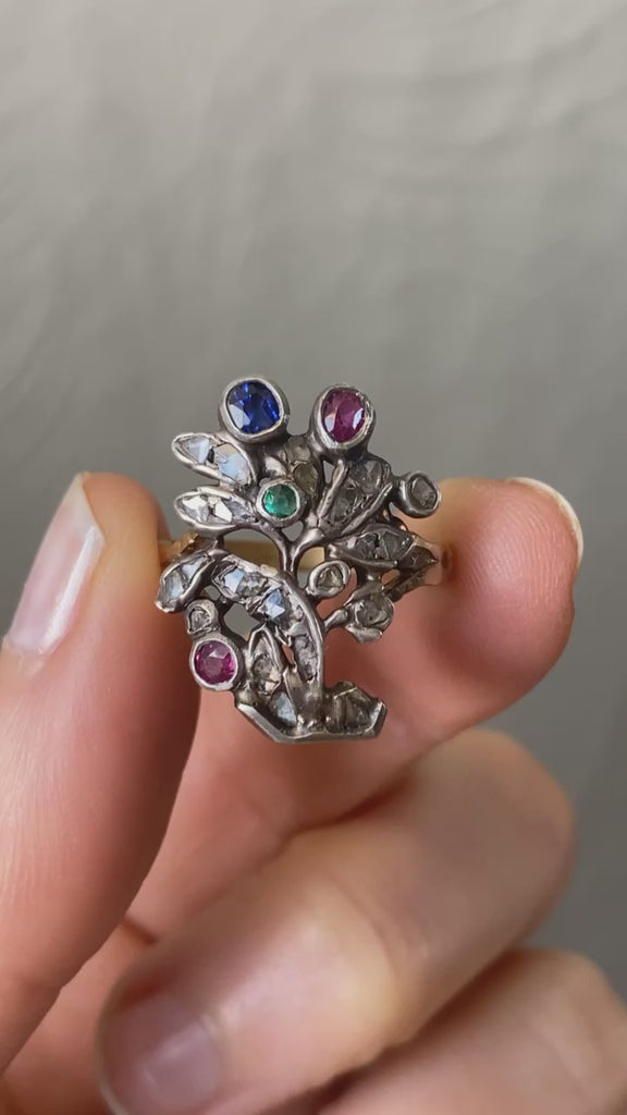 This ring was crafted in the early Victorian era. It features rubies, sapphire, emerald and closed back rose cut diamonds in silver settings on a (tested) 18k gold shank. The floral face measures 20.7mm" tall by 17.1mm" at its widest. This ring is a size 6.25 and weighs 4g. Wear commensurate with age and use. You will receive the pictured ring.