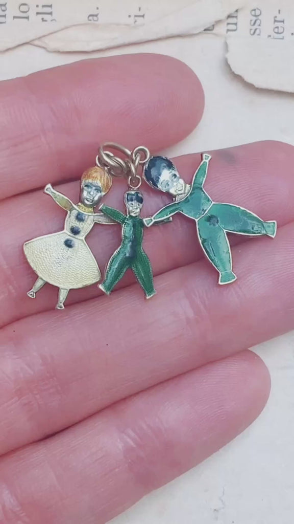 Nénette and Rintintin charms are scarce to begin with, even scarcer accompanied by their child. These enamel versions were crafted in 18k and weigh 4.4g. They measure approximately 19mm x 12mm, 19.3mm x 13.4mm, 10.5mm x 9.4mm .... and hang about 29mm. Wear commensurate with age and use. A wonderful and historic charm set born out of the French Resistance.