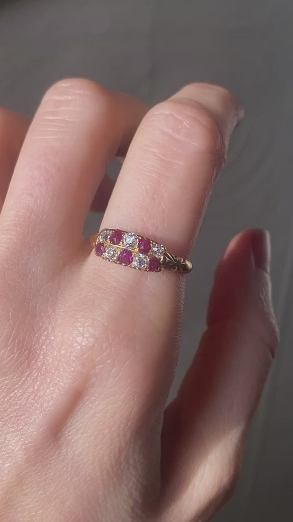 The old cut diamonds weigh an estimated 0.4ct and rubies 0.7ct, with the entire ring weighing 3.1g. This ring is a size 7.25. It is hallmarked for 18k, Chester, 1895. It can be resized by your jeweller. In wonderful condition, with minor wear commensurate with age and use. Can be sized by your jeweller. You will receive the pictured ring.