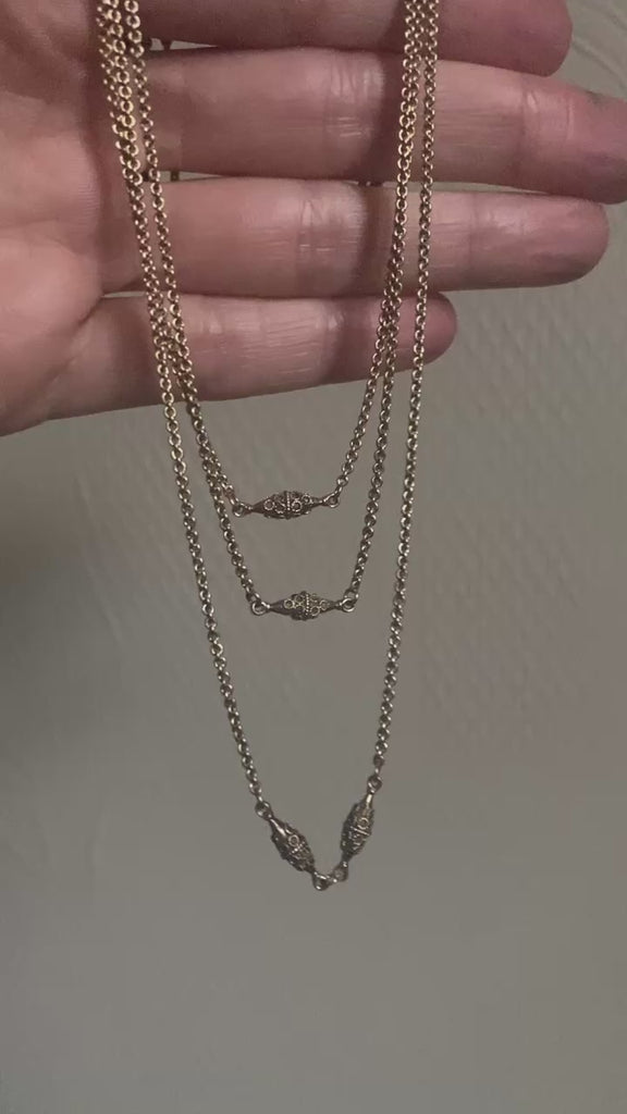 A Victorian necklace with decorative barrel beads on a cascading triple strand. Each chain is a fixed length and the necklace closes at the back with a dog clip. A beautiful and romantic piece.
