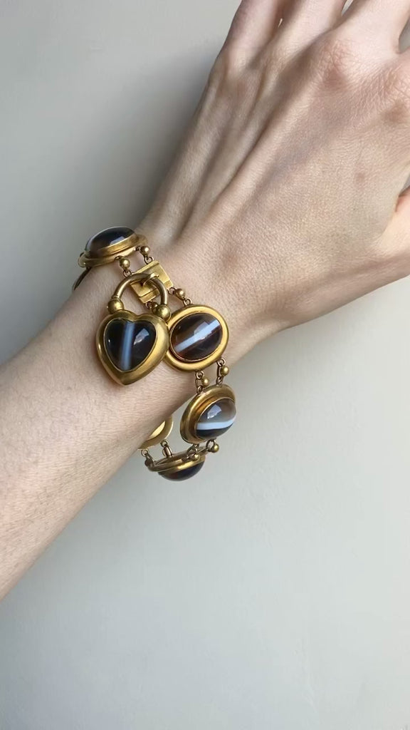 Antique Victorian Banded Agate Heart Padlock Bracelet - 14k