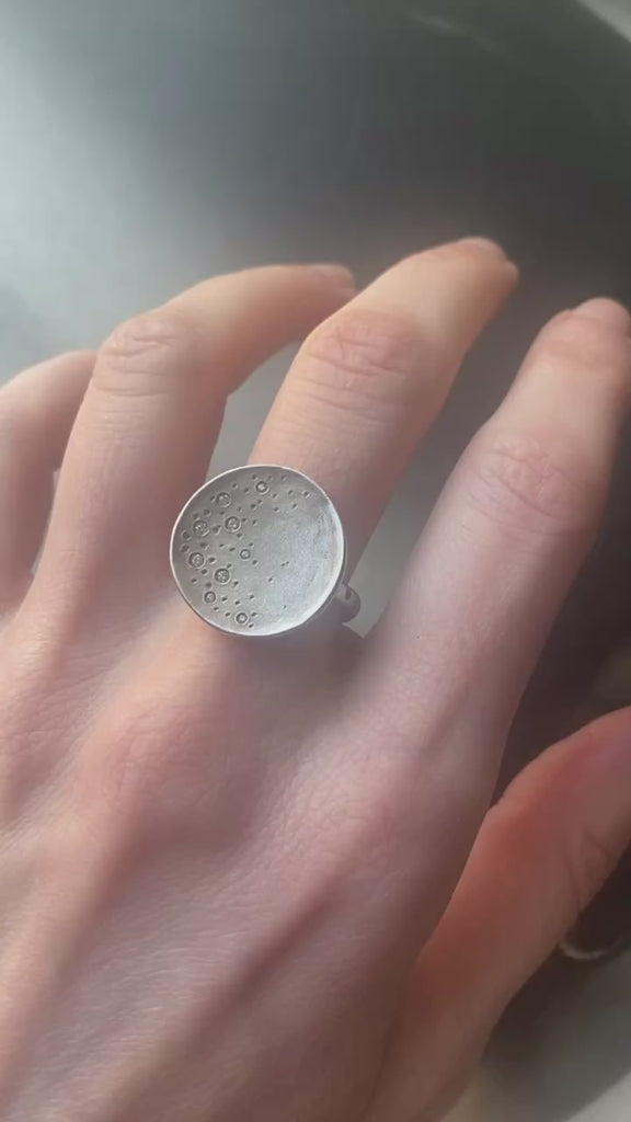 Their "Watch Over Me" moon ring features a beautiful large, textured moon face dotted with white diamonds.