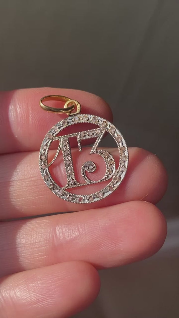 An extremely rare and beautiful antique art nouveau French pendant c.1900 featuring the lucky number "13", set into 18k white and yellow gold with rose cut diamonds in a milgrain setting typical of the era.
