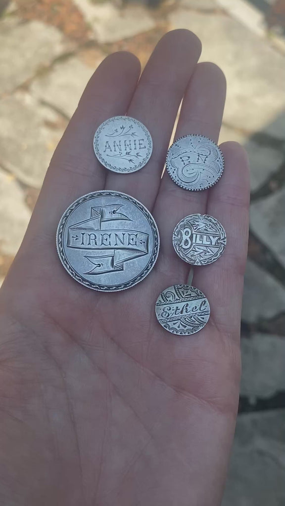 It's thought that love tokens originated as early as the 13th century. They are are coins where one side has been smoothed down and then hand engraved. Sentimental "messages" could include a lover's initials or monogram, name, dates, or an image meant to remind or for luck. They were often bent to create a wave to try to prevent them from being used as currency.