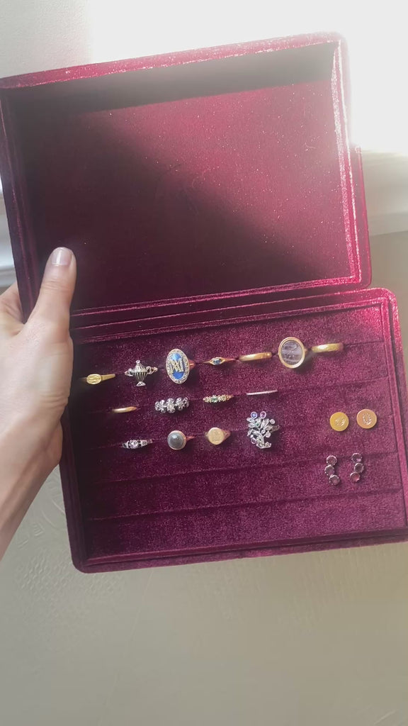 A lush custom made-for-us display box to store and protect your treasures. Gorgeously made in a deep oxblood velvet, the entire lid and bottom are wrapped in velvet.