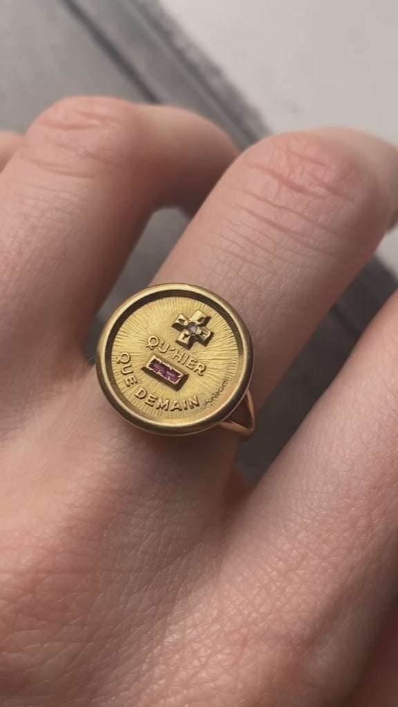 This vintage ring has the word “plus” symbolized by a plus sign set with a diamond and “moins” symbolized by a minus sign set with 2 synthetic rubies. Pendant face is signed A. Augis, with a partial French punch for 18k gold on outer shank of the ring.