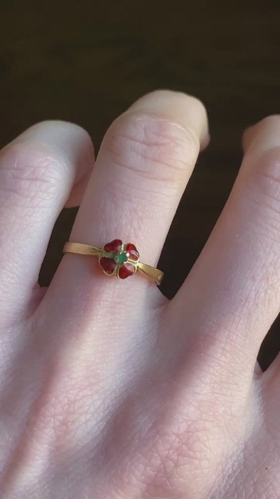 This beautiful vintage flower ring is decorated with enamel petals and a central green stone.