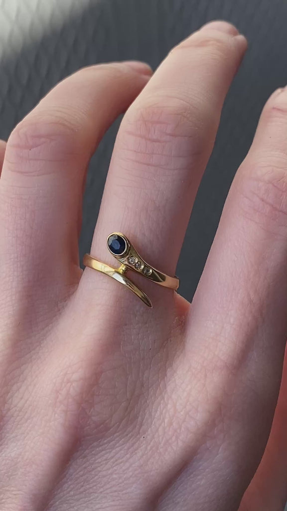This size 6 vintage gold ring has been fashioned as a snake with a sapphire "eye" and diamonds along its neck. This ring weighs approximately 2.37g and was made in Italy and is marked "750" for 18k gold.