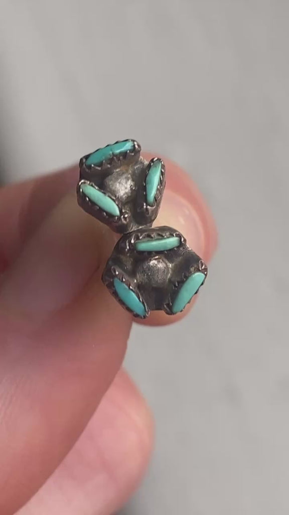 Beautiful vintage c. 1970s Zuni stud earrings with small, expertly cut turquoise stones set into silver. The most traditional Zuni style of jewelry is called "petit point", which can be identified by tiny turquoise stones each supported in its own bezel. It is extremely time-consuming work and is very delicate in appearance.