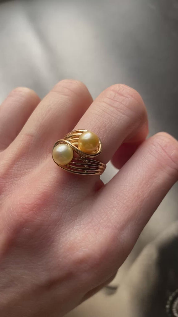 Bypass rings date back to the Victorian era when the design symbolized two souls uniting, while maintaining their individuality. This style, characterized by two bands that cross or overlap, saw a resurgence during the Art Deco period for its unique and meaningful design. In this vintage example, 2 pears are sensuously wrapped in undulating waves of gold.